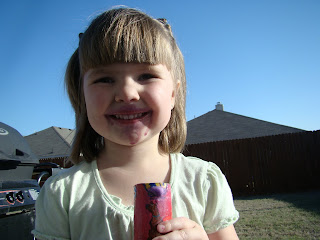 Then it was time for some real fun!! Bring out the push-ups!! Emilee chose grape and Cutter chose strawberry! We had to eat them outside, because I knew it was going to get messy!!
